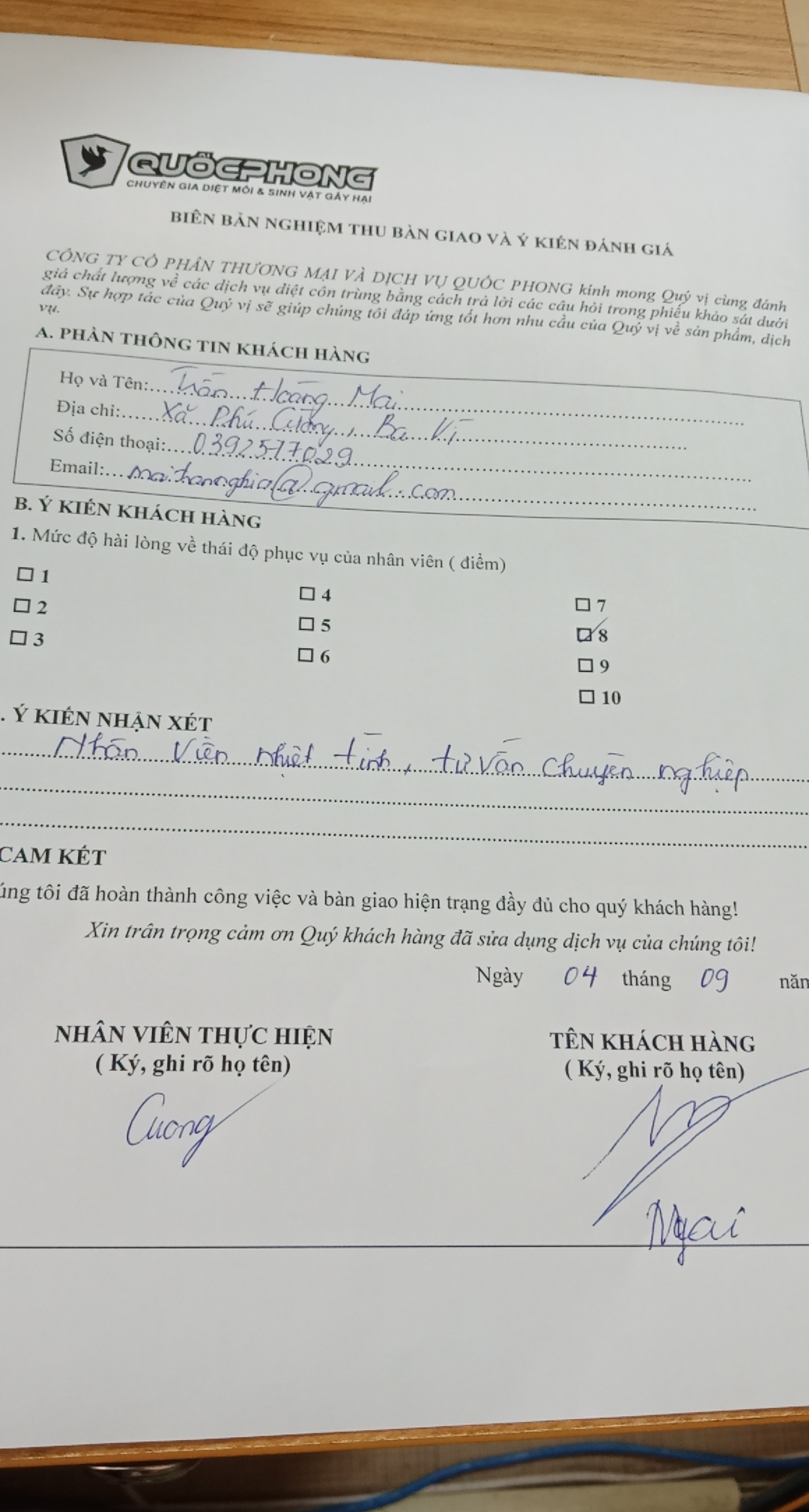 - Bản nhận xét ý kiến Khách hàng cho Dịch vụ diệt mối tận gốc Quốc Phong