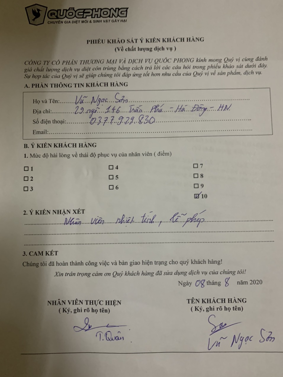 - Bản nhận xét ý kiến Khách hàng cho Dịch vụ diệt mối tận gốc Quốc Phong