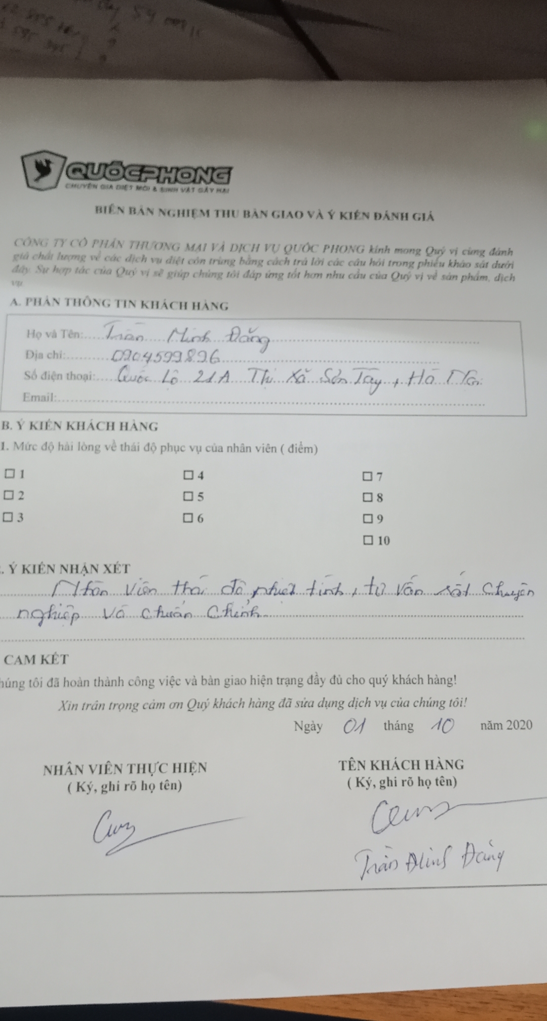 - Bản nhận xét ý kiến Khách hàng cho Dịch vụ diệt mối tận gốc Quốc Phong